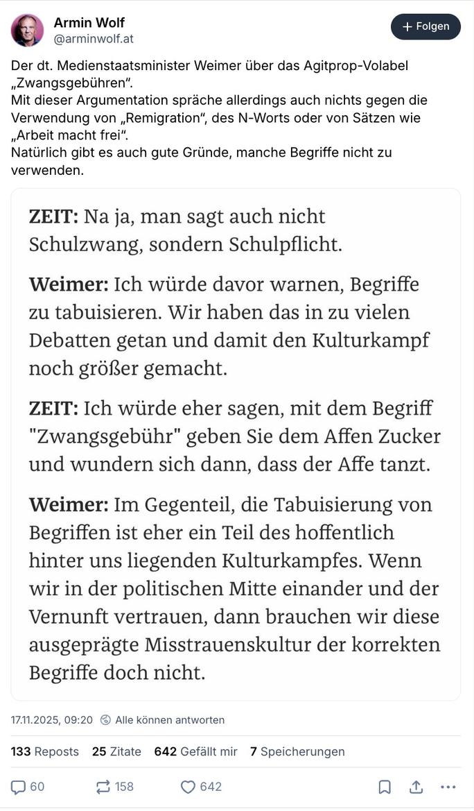 Man stelle sich vor, einem nichtlinken Journalisten wäre so eine Entgleisung auf X passiert. Beim Welt-Kolumnisten Norbert Bolz stand wegen eines vergleichsweise wesentlich harmloseren Tweets die Polizei um 6:00 vor der Türe.