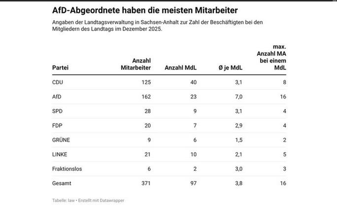 Was für eine leistungsstarke Truppe die AfD da im Landtag Sachsen-Anhalt aufgeboten hat! Während andere Parteien mit lächerlichen ein bis drei Mitarbeitern auskommen müssen, gönnt sich die AfD sieben pro Kopf – einer hat sogar 16! Offensichtlich reicht ein einzelner AfD-Mitarbeiter nicht mal aus, um einen Stapel Akten von A nach B zu tragen, ohne sich dabei in den eigenen Verschwörungstheorien zu verlieren.