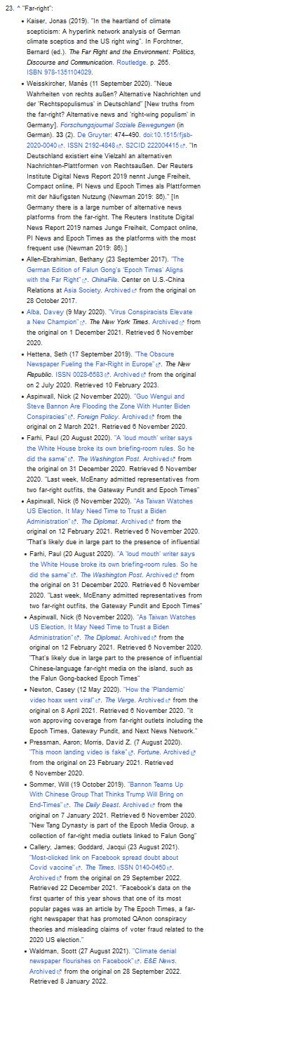 "Die Gruppe für darstellende Künste Shen Yun und die Medienorganisation The Epoch Times sind die wichtigsten Outreach-Organisationen von Falun Gong.[4] Beide fördern die spirituellen und politischen Lehren von Falun Gong.[109][110][111] Sie und eine Vielzahl anderer Organisationen wie New Tang Dynasty Television (NTD) fungieren als Ableger von Falun Gong. Diese Erweiterungen fördern die neue religiöse Bewegung und ihre Lehren. Im Fall von The Epoch Times verbreiten sie auch Verschwörungstheorien wie QAnon und Impfstoff-Fehlinformationen[112] sowie rechtsextreme Politik in Europa und den Vereinigten Staaten. [59][24] [25] Ungefähr zur Zeit der US-Präsidentschaftswahlen 2016 begann The Epoch Times, Artikel zu veröffentlichen, die Donald Trump unterstützten und seine Gegner kritisierten. [113][25] Falun Gong-Organisationen waren auch aktiv an der Förderung der europäischen radikalen Rechten beteiligt. [24] "
