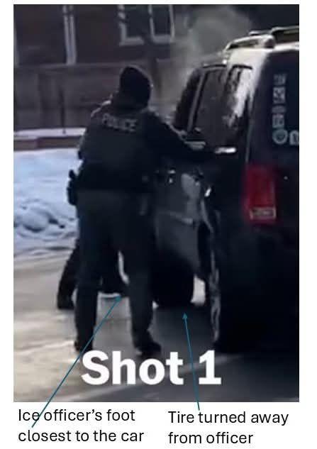 Wie wir sehen, befindet sich der schießende ICE-Beamter nicht nur nicht in der Fahrt-/Fluchtlinie des Autos, sondern er befand sich schon neben dem Vorderrad.