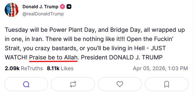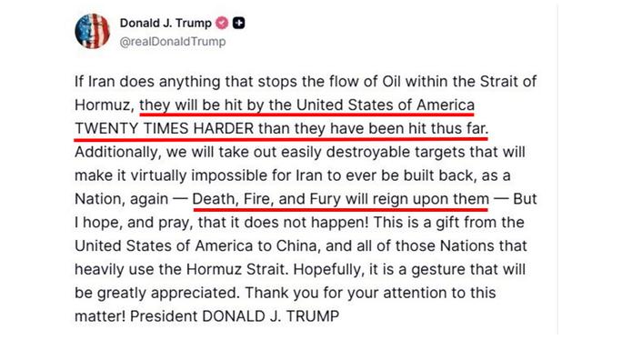 »Am Dienstag wird es im Iran den Tag der Kraftwerke und den Tag der Brücken in einem geben. So etwas hat es noch nie gegeben!!! Öffnet die verdammte Meerenge, ihr verrückten Mistkerle, oder ihr werdet in der Hölle leben – IHR WERDET SEHEN! Gelobet sei Allah. Präsident DONALD J. TRUMP«
