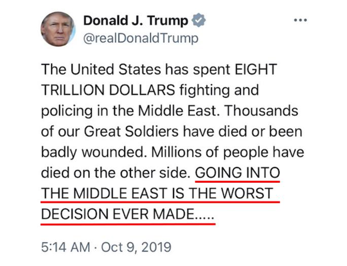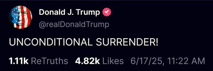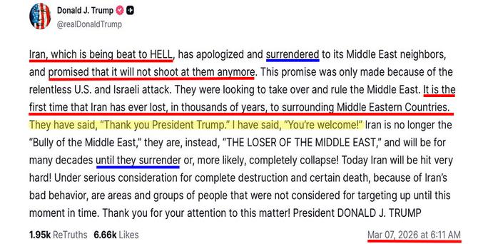 "Der Iran, der gerade in die Hölle geprügelt wird, hat sich entschuldigt und gegenüber seinen Nahost-Nachbarn kapituliert, und versprochen, nicht mehr auf sie zu schießen." Aha. Weiter unten schreibt er dann, dass sie solange die "Verlierer des Nahen Ostens für viele Jahrzehnte sein werden, bis sie kapitulieren." Also was denn nun, Donald? Entscheid dich mal. Schießen tun die übrigens immer noch wie die Wilden – und das während sie doch gerade in die Hölle geprügelt werden..