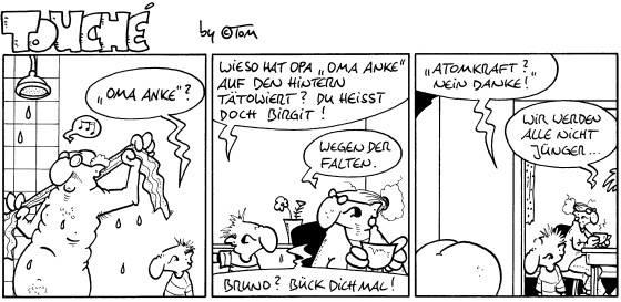 Ich will auch kein Tatoo. Ich habe schon eins im Gelbdeutel, diese staatlich verordnete Indiskretion, diese bodenlose Unverschämtheit ist mir schon unerträglich genug: ein Ausweis, auch noch als Personal. Personal von wem?! Biometrisch akkurat, erkennungsdienstlich wertvoll, ab-so-lut fälschungssicher (als ob mich jemand fälschen wollte! lächerlich) und, das ist der Gipfel, mit einer ein-eindeutigen Kennung versehen. Damit degradiert er mich vollständig, denn ich kann niemals hoffen weniger als zweideutig zu sein in dieser dialektischen Welt. Nein nein, damit das klar ist, ich bin nicht bi-, sonstwas- oder asexuell, obwohl für mich die Reproduktionsphase abgeschlossen ist. Meine Wixpraktiken habe ich selber entwickelt und brauche dafür keine Hilfestellung.