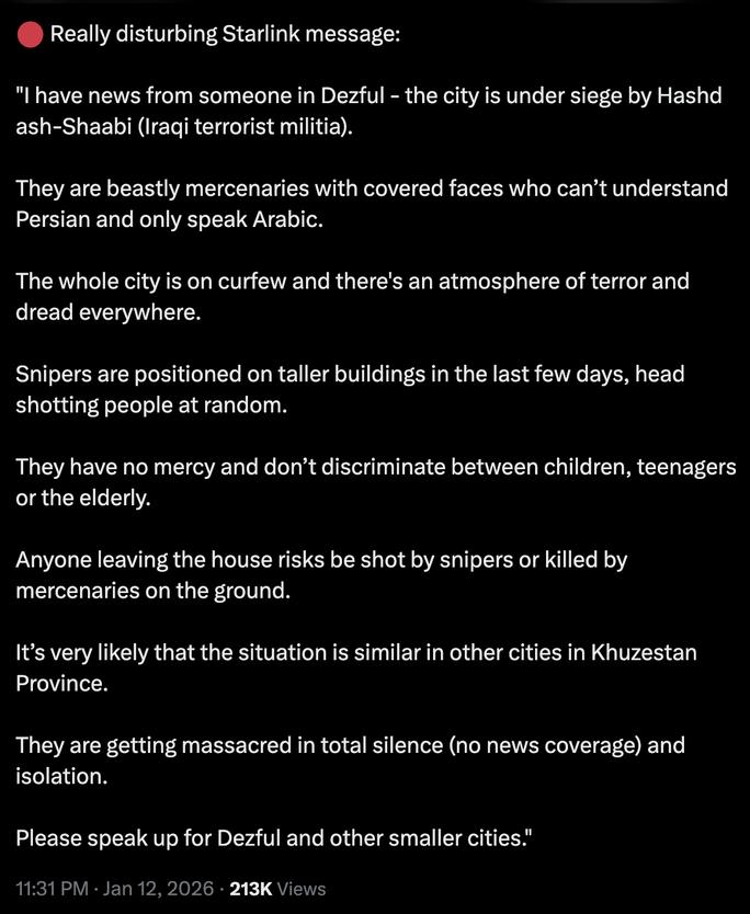 AUf X brechen sich aktuell immer mehr Meldungen Bahn, die von irakischen Milizen in der iranischen Provinz Khuzestan berichten, die dort auf einheimische Iraner losgehen und auch kleine Kinder, Alte und Kranke ermorden.