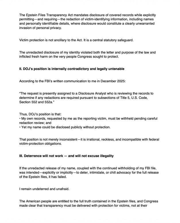 Das DOJ verletzt doppelt: Erstens die Anonymisierungspflicht für Opfer; zweitens die Veröffentlichungspflicht nach FOIA. Tausende Seiten Akten werden zurückgehalten, während Prominente geschützt bleiben. Klagen gegen FBI und DOJ wegen Versäumnissen seit 1996 häufen sich.