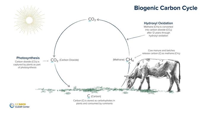 Man nimmt oft an, dass Rinder zum Klimawandel beitragen, weil sie Methan (CH4), ein Treibhausgas, ausstoßen. Zwar ist das richtig, Rinder stoßen tatsächlich Methan aus, doch ist dies Teil eines wichtigen natürlichen Kreislaufs, des sogenannten biogenen Kohlenstoffkreislaufs.