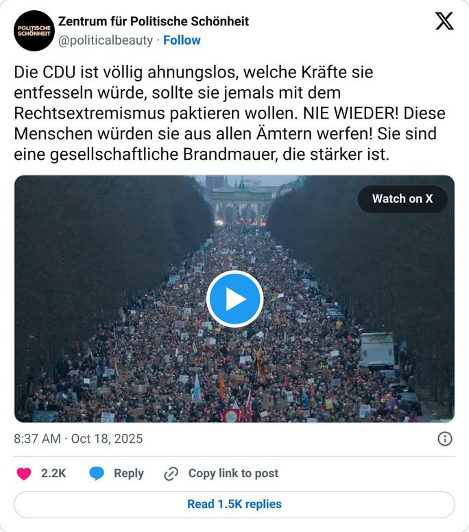 Das sogenannte Zentrum für politische Schönheit, eine der radikalsten linken Kampforganisationen des Landes, schreibt es auf X ganz offen, sie drohen mit dem Mob auf der Straße: