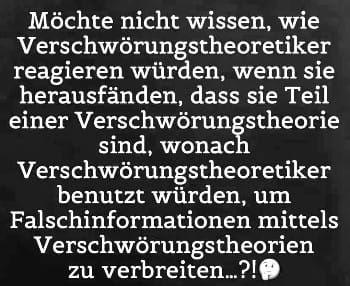 Die Verschwörungstheoretiker teilen dieses Bild, um die Verschwörung aufzudecken, aber merken nicht, dass sie selbst Teil der Verschwörung sind, die ihr Denken durch Verschwörungstheorien kontrolliert. Denn – so unglaublich es klingt – die wahre Verschwörung läuft nicht hinter den Kulissen, sondern im Kopf derer, die glauben, sie hätten die Verschwörung längst durchschaut.