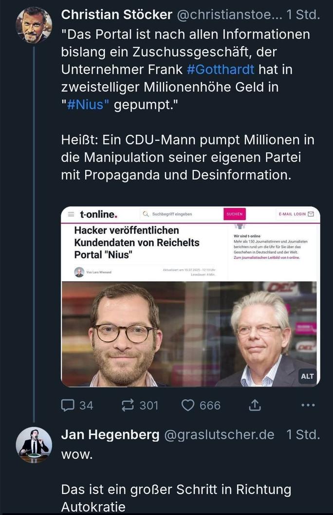 Der ekelhafte, rechtsradikale Hetzer, Julian Reichelt, einst Bild-Chefredakteur und wegen sexueller Übergriffigkeit auf Untergebene bei Springer gefeuert, und sein rechtsextremes Hetzportal "Nius" lebt von den Subventionen die Frank Gotthardt ihm zahlt, der selbst Jünger des IT-Tec-Multimilliardärs Peter Thiel ist, der Demokratie als Staatsform ablehnt.