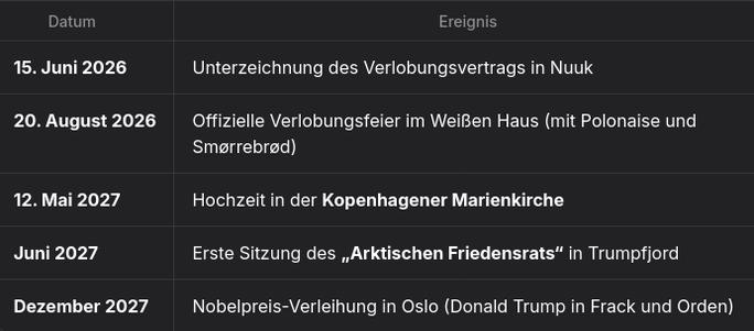 In Anerkennung der historischen Bedeutung dieser Verbindung für die internationale Diplomatie, den transatlantischen Frieden und die kulturelle Annäherung zwischen den Vereinigten Staaten von Amerika und dem Königreich Dänemark haben die unterzeichnenden Parteien folgende Vereinbarungen getroffen. Die Unterzeichnung des Verlobungsvertrags findet am 15. Juni 2026 in Nuuk, Grönland, statt – ein Symbol für die neue Ära der Zusammenarbeit und den offiziellen Übergang Grönlands in die Obhut der Familie Trump als Brautbeigabe und zukünftiges Herzogtum.