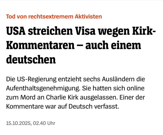 Eine andere Person habe auf Deutsch geschrieben: »Wenn Faschisten sterben, beschweren sich Demokraten nicht«. Das Ministerium fügte hinzu, es identifiziere weiterhin Visumsinhaber, die die Ermordung Kirks bei einer Veranstaltung an einer Universität in Utah im vergangenen Monat gefeiert hätten."