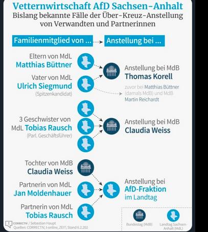 In der AfD Sachsen-Anhalt häufen sich Vorwürfe, dass führende Politiker ein Netzwerk der gegenseitigen Begünstigung aufgebaut haben, von dem vor allem ihre eigenen Familienangehörigen profitieren. Recherchen zeigen, dass Verwandte von Spitzenfunktionären gezielt in politischen Büros und Fraktionen beschäftigt werden – oft mit gut dotierten Stellen. Besonders auffällig ist der Fall des AfD-Spitzenkandidaten Ulrich Siegmund, dessen Vater seit Jahren bei verschiedenen Abgeordneten angestellt ist und ein monatliches Gehalt von 7.725 Euro bezieht. Auch die Geschwister des parlamentarischen Geschäftsführers Tobias Rausch sowie die Eltern weiterer Abgeordneter arbeiten in ähnlichen Konstellationen für die Partei.