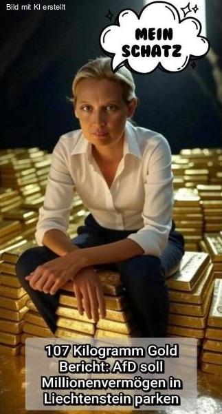 Das Ganze offenbart den wahren Stil der AfD: Wer kann sich als Vertreter des kleinen, einfachen Volkes sehen, wenn er mit Luxusautos prahlt und Millionen in Liechtenstein bunkert. Die Verachtung für den „einfachen Arbeitnehmer“ wird durch solche Manöver deutlich – ganz im Stil von Trump, der pompösen Selbstdarstellung und dem verschwenderischen Umgang mit Geld und Macht. Die AfD präsentiert sich nicht als kämpfende Partei für den kleinen Mann, sondern als dekadenter Machtapparat, der seine Finanzen lieber im Ausland versteckt als offenlegt. Das Gold in Liechtenstein ist ein Symbol dafür – ein Symbol für Scheinheiligkeit und fehlende Bodenständigkeit.