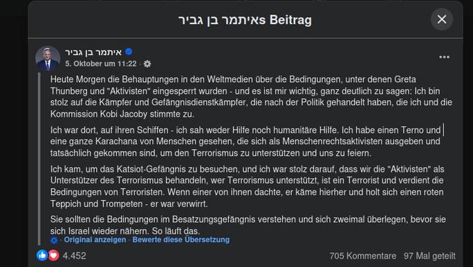 Heute Morgen die Behauptungen in den Weltmedien über die Bedingungen, unter denen Greta Thunberg und "Aktivisten" eingesperrt wurden - und es ist mir wichtig, ganz deutlich zu sagen: Ich bin stolz auf die Kämpfer und Gefängnisdienstkämpfer, die nach der Politik gehandelt haben, die ich und die Kommission Kobi Jacoby stimmte zu.