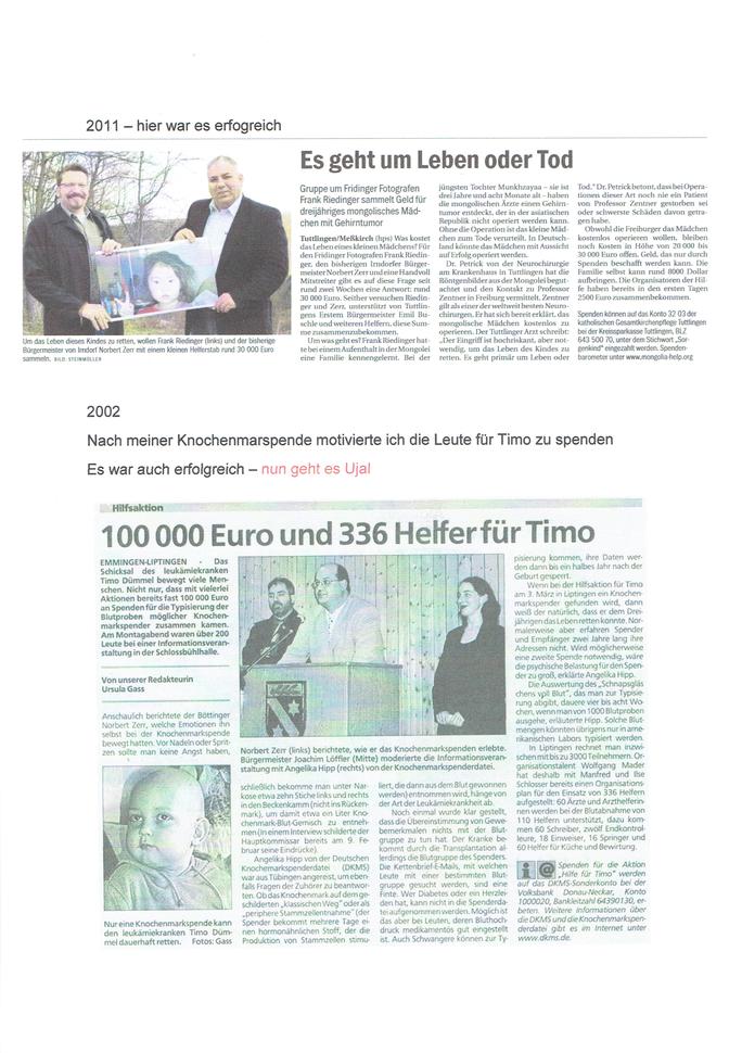 Mit dieser Erfahrung kam ich zum Fall Timo. Es ging um das Leben des leukämiekranken Timo. Ich klärte über die Knochenmarkspende auf, um möglichst viele Menschen für die Typisierung zu finden oder zu ermutigen. Insgesamt klappte alles. Timo ist heute gesunder Ingenieur oder Master wie es heute heisst.