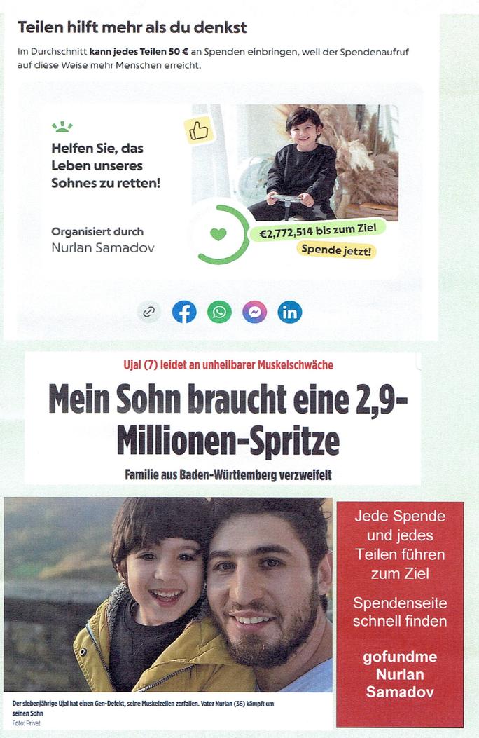 Mein Sohn schickt mir gelegentlich eine Online-Ausgabe, die er unregelmäßig von einem Arbeitskollegen bekommt. Ich öffnete die betreffende Ausgabe und sehe ein Bild mit einem jungen Mann zusammen mit einem Kind. Die Überschrift war es, wo ich dachte, es haut mich um. Um das Leben eines Kindes zu retten wird eine Spritze für 2,9 Mio € benötigt. Eine Spritze, also ein Medikament für so viel Geld? Das weckt natürlich auch Neugier. Meine Gedanken zu dieser Summe und was damit wahrscheinlich zusammenhängt spare ich mir.