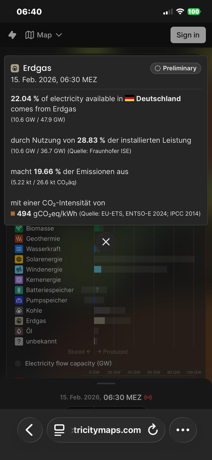 Weil die deutschen Erdgasspeicher beinahe leer sind, muss man die gasbetriebene Stromerzeugung zurückfahren und wie oben zu sehen auf Importe oder eigene Kohle zurückgreifen.