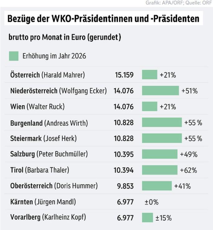 Es ist für den ORF eine beachtliche Rechercheleistung, dass er in seinem Bericht umgehend eine Tabelle mit allen Bezügen der WK-Präsidenten und Erhöhungen des kommenden Jahres präsentiert. Der Kärntner Präsident hat offenbar den (Be)Zug versäumt und (bislang) keine Erhöhung beantragt. Der Vorarlberger WK-Kopf hat laut ORF origineller Weise +- 15% bezogen. Das sind in Zahlen: 6.977 Euro pro Monat. Die naheliegende Erklärung für dieser wundersame Formel: Kopf soll plus 15 Prozent bekommen (demnach demnächst 8.023 Euro), der ORF-Grafiker hat aber den Betrag in Zahlen nicht rechtzeitig vor Publikation erhalten.