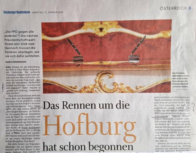 17. Jänner 2025 „Das Rennen um die Hofburg hat schon begonnen,“ so die Salzburger Nachrichten (17.1.26) zur Halbzeit der zweiten Amtszeit von VdB. Wer ins Rennen geht, ist demnach schon ausgemachte Sache: Die FPÖ gegen alle anderen!
