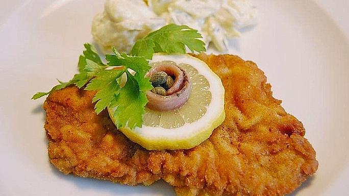 Da ist einmal das Wiener Schnitzel und ist es mit einer Zitrone und mit einem Sardellenringerl mit Kapern garniert, nennt man das Wiener Garnitur