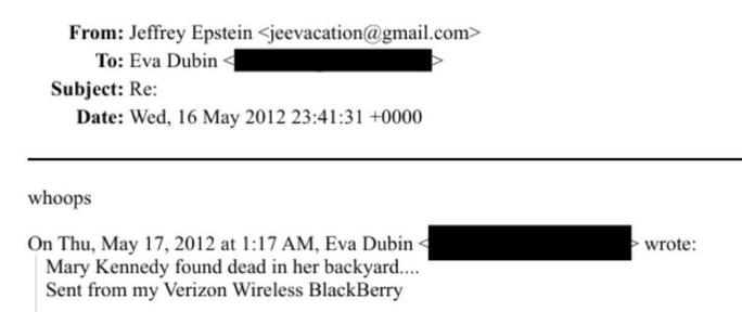 Epstein, nachdem ihm mitgeteilt wurde, dass Mary Kennedy tot in ihrem Garten gefunden wurde: „Ups.“