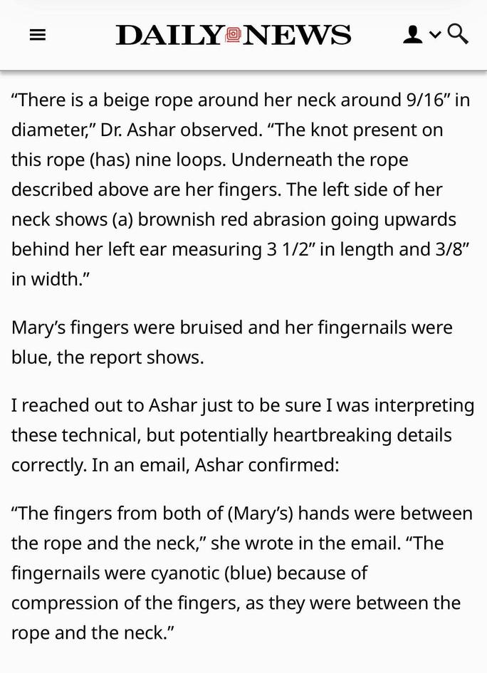 Die Autopsie ergab, dass Mary Kennedy, die sich damals in einer schwierigen Scheidung von ihrem Noch-Ehemann RFK Jr. befand, die Finger zwischen Hals und Schlinge hatte, als ob sie Zweifel bekäme.
